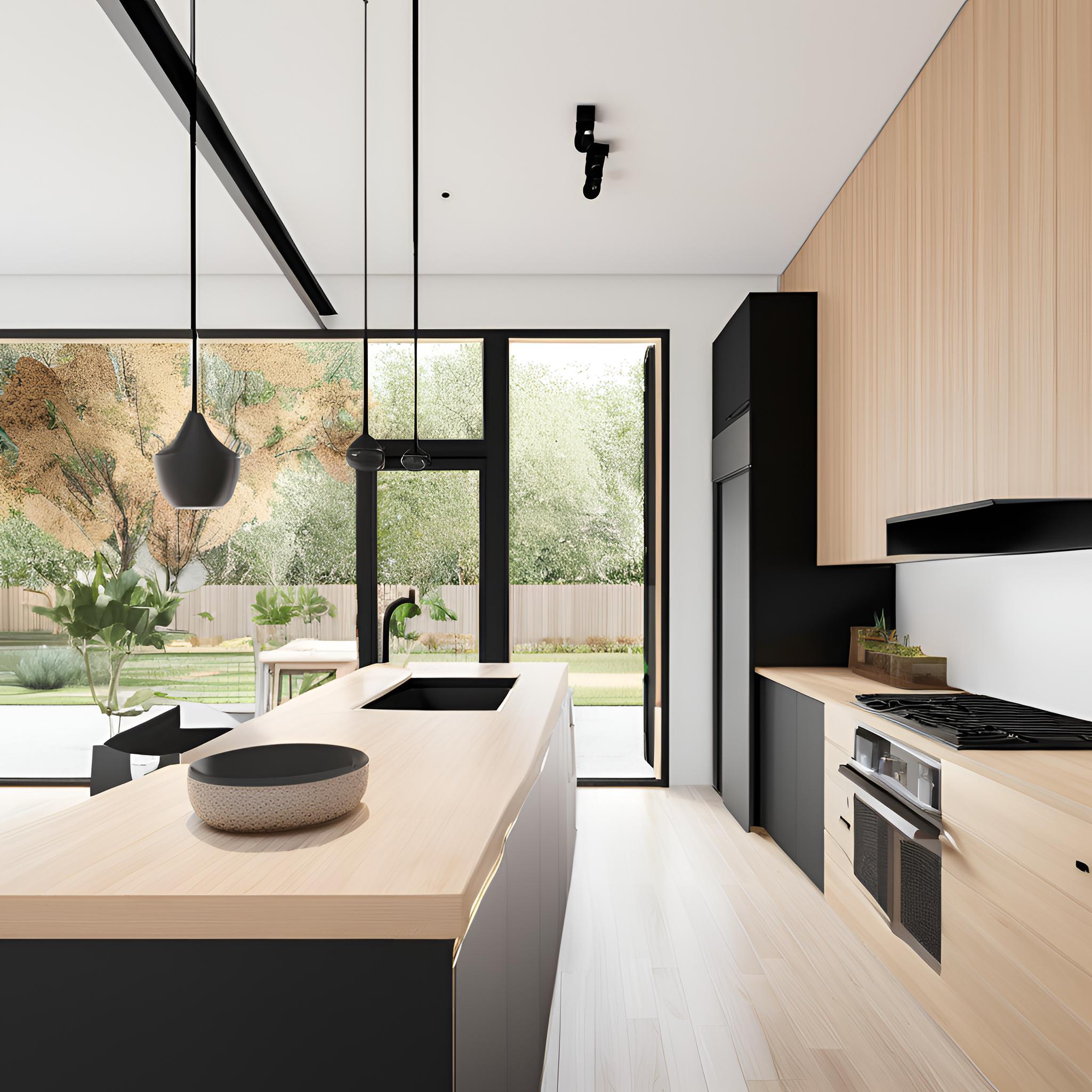 La cocina como un espacio de líneas limpias, donde los detalles en negro enmarcan las superficies claras de los gabinetes y las encimeras. Los pisos de madera añaden una calidez visual que suaviza los tonos monocromáticos del ambiente. La isla central es el corazón de este espacio y la luz natural quense filtra desde el jardín, crea un juego de sombras y contrastes que realzan la sencillez del diseño.