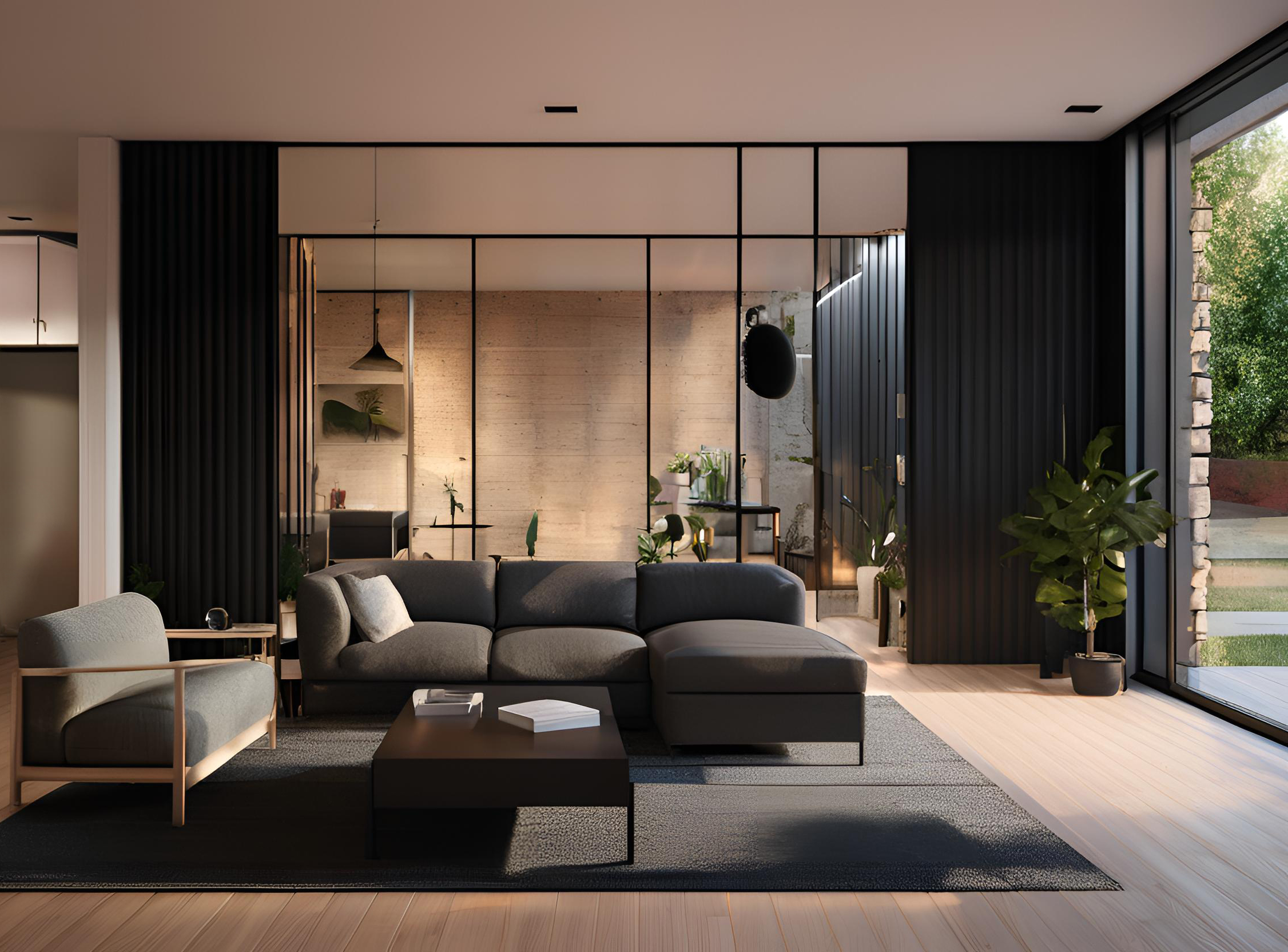 Se crea un espacio abierto de relajación. Las líneas simples del mobiliario se ven enriquecidas por la textura cálida de la madera y los detalles en negro que añaden profundidad al ambiente. Las ventanas permiten que la luz inunde el espacio.