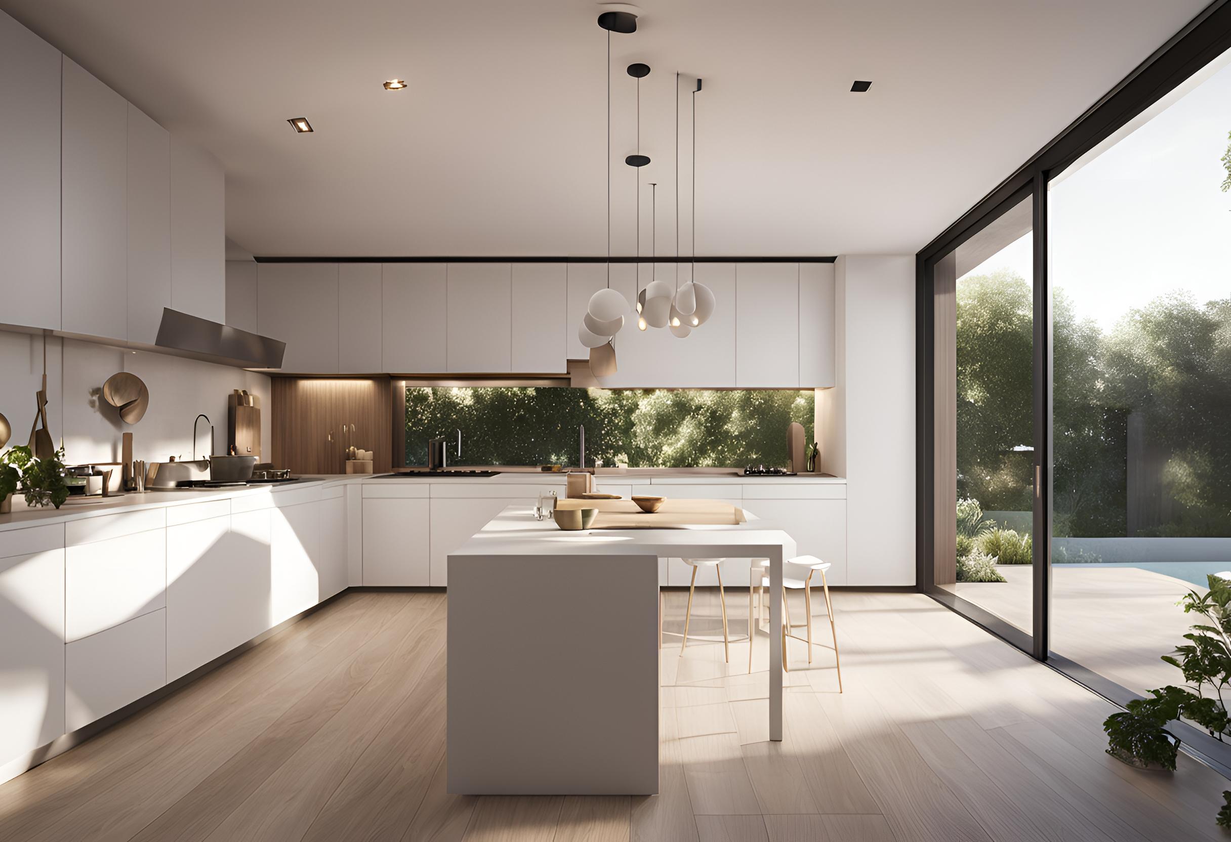 La cocina respira sutilmente al living, creando un ambiente fluido y acogedor. Las paredes blancas y los muebles en tonos similares permiten que la luz rebote, llenando el espacio de luminosidad. La disposición abierta invita a la familia a compartir momentos, desde preparar comidas hasta disfrutar de un café en la isla central, donde la luz natural se filtra por las ventanas.