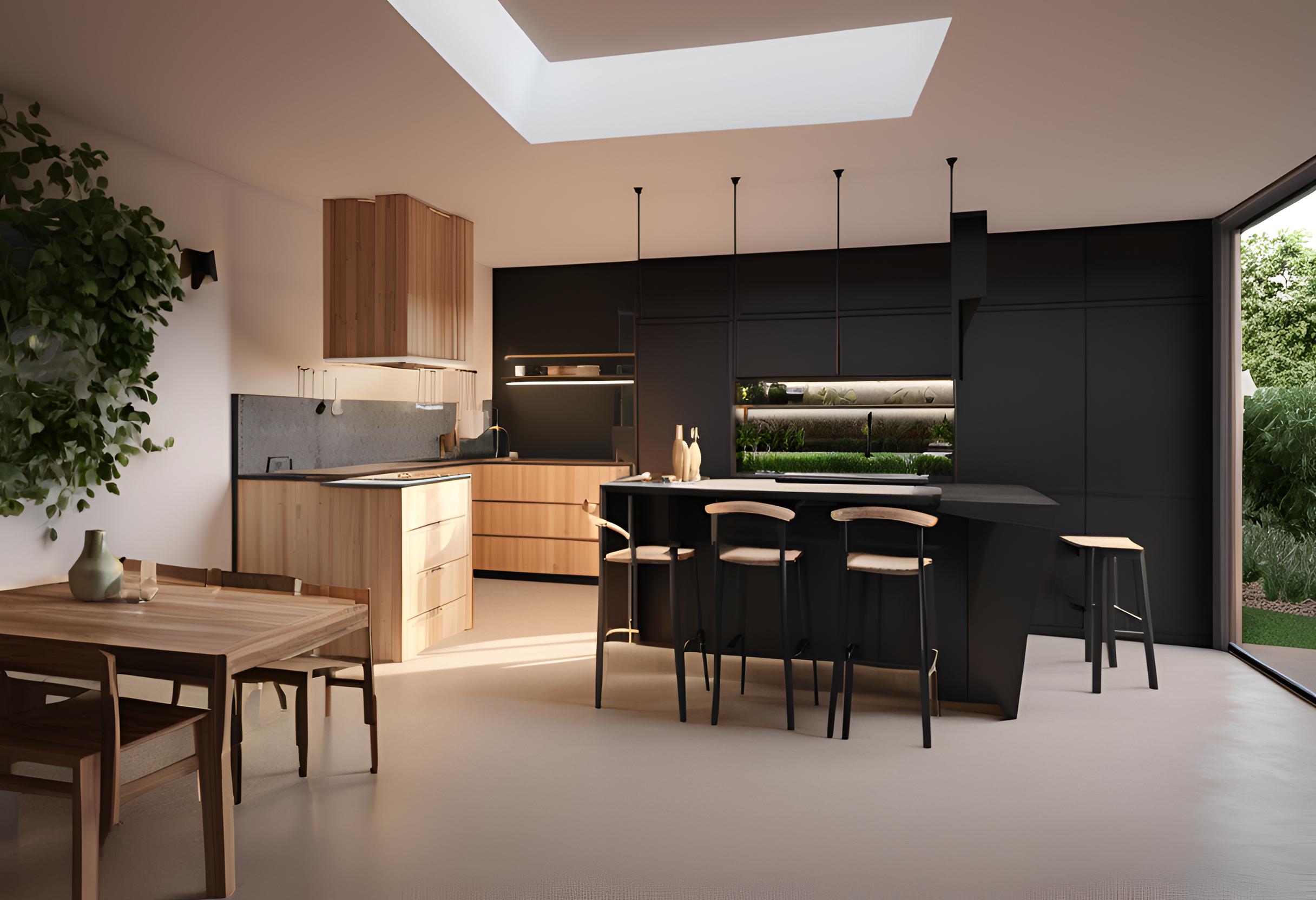 La cocina es un espacio donde el minimalismo cobra vida. Las superficies negras de las mesadas contrastan con los gabinetes de madera clara, aportando calidez en contraste con los acabados modernos. La isla central, en negro mate, se convierte en el punto de encuentro donde la familia se reúne, mientras la luz natural inunda el espacio a través de ventanales que ofrecen vistas al jardín.